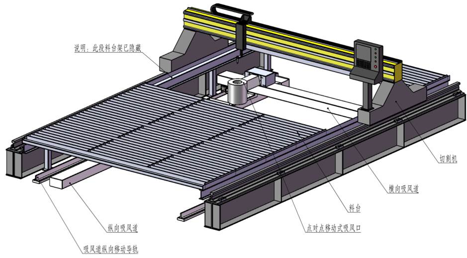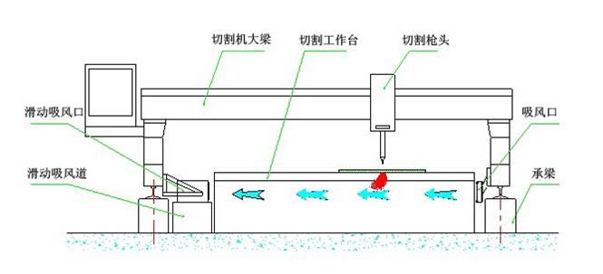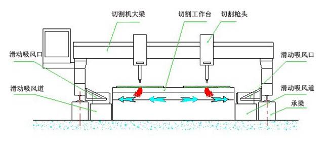 側(cè)吸式煙塵凈化系統(tǒng)采用吸風(fēng)口固定在切割機(jī)龍門(mén)架上,吸風(fēng)口與吸風(fēng)道之間通過(guò)密封皮帶密封,吸風(fēng)口可隨龍門(mén)架在吸風(fēng)道上來(lái)回移動(dòng)吸風(fēng),將切割的粉塵吸除。