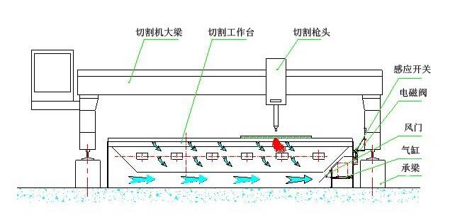 下吸式煙塵凈化系統(tǒng)抽風(fēng)是通過(guò)下吸式抽風(fēng)切割臺(tái)來(lái)實(shí)現(xiàn)的,下吸式抽風(fēng)切割臺(tái)分成若干個(gè)區(qū)域,每個(gè)區(qū)域設(shè)計(jì)有風(fēng)門(mén)吸風(fēng),切割槍頭在每個(gè)區(qū)域切割時(shí),相應(yīng)區(qū)域的風(fēng)門(mén)打開(kāi)抽風(fēng),將切割機(jī)的粉塵吸除。